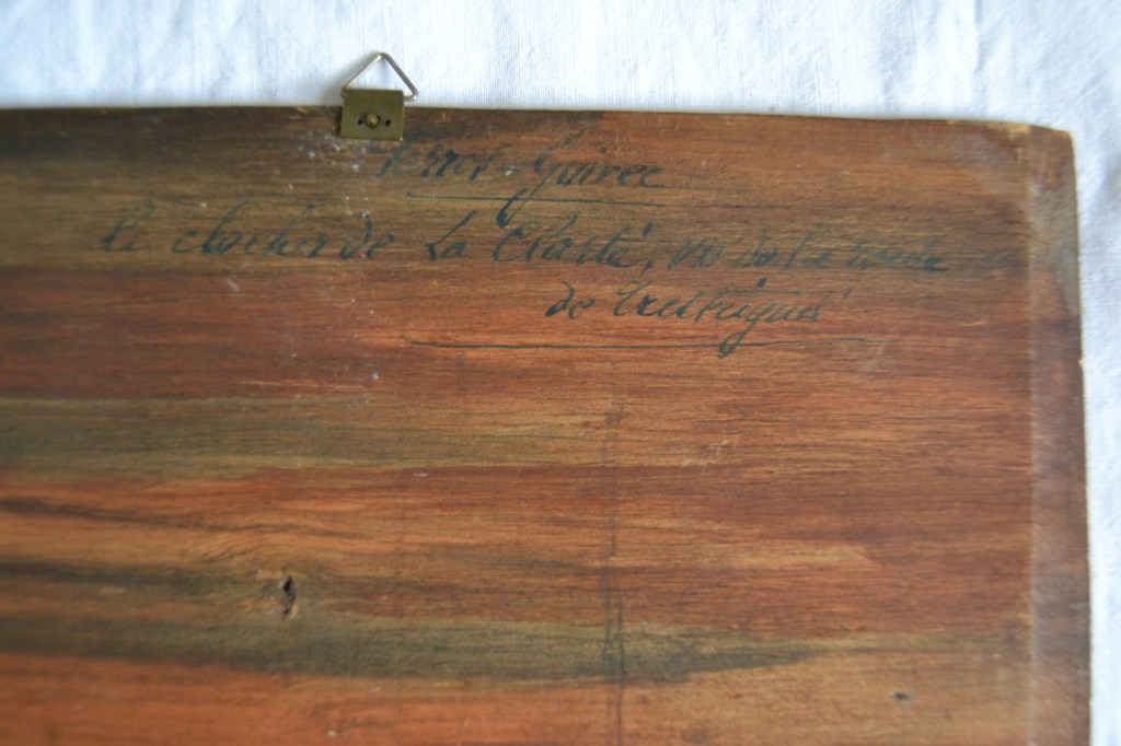 Verso du panneau « Le clocher de la Clarté vue de la route de Trestrignel« .