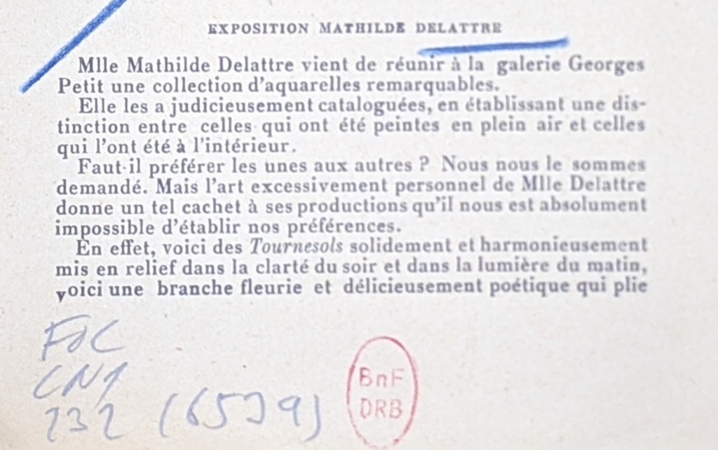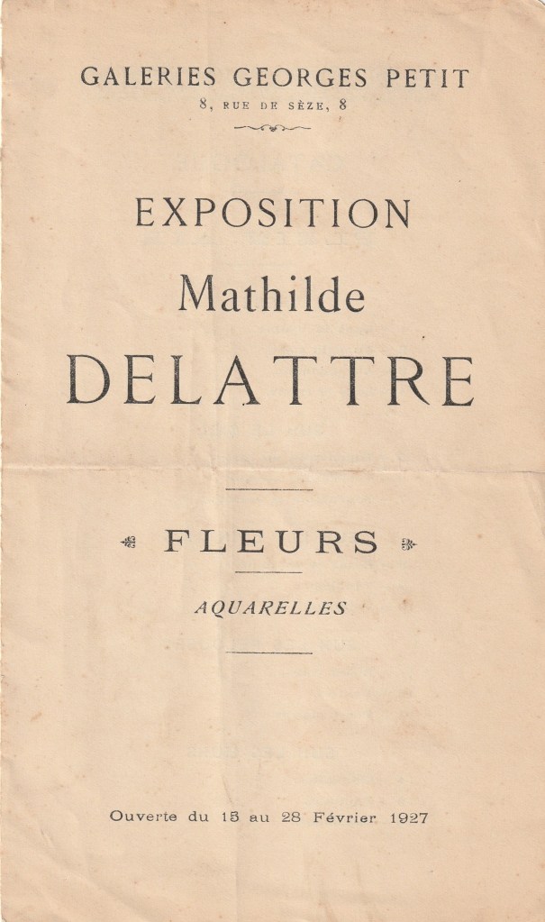 « Je vous envoie en même temps que ces lignes (…) 1 ou 2 articles de journaux, parmi beaucoup que j’ai reçus à propos d’une exposition particulière que je viens de faire. Je joins aussi un catalogue & une carte d’invitation, afin que vous vous rendiez compte de ce que j’avais. J’ai eu au point de vue artistique un très grand succès, beaucoup de visiteurs chaque jour. Et l’ensemble faisait beaucoup mieux que ce que j’avais rêvé . De l’avis de tous, c’était, ou plutôt on entendait dire sans cesse : « quelle personnalité, quelle distinction, quelle variété »… « jamais de ma vie exposition de fleurs aussi particulière » etc.. etc !! Le jour du vernissage j’en ai vendu 12, et 27 en tout. C’est très beau, vu ce moment où les affaires sont si mauvaises ! Tous à la galerie m’ont dit que si j’avais fait cela un an plus tôt, j’aurais tout vendu. Mais toute ma vie, il est écrit sans doute que j’arriverai toujours trop tard. Néanmoins je suis très contente. Je rêvais cela depuis tant d’années & je ne pensais pas pouvoir y arriver, ce fut mieux que je n’aurais osé l’espérer ».