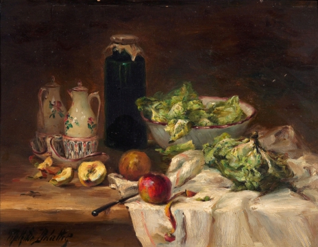 Il s’agit probablement de Dans la cuisine, présentée en 1897 à l’Union. L’artiste y a-t-elle représenté ses propres céramiques décorées ? Lot de vente Uppsala Auktionskammare 2005