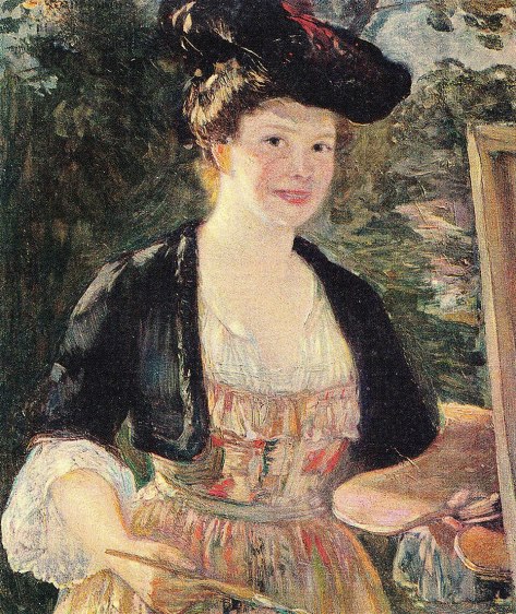 Eugénie Sommer, de quelques années l’aînée de Mathilde, deviendra Eugenia Hauptmannová-Sommerová en 1894; veuve en 1901, elle sillonnera l’Europe et les salons. Et fait son autoportrait vers 1914.