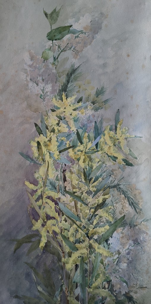 Longtemps exposée dans la famille, les teintes d’arrière-plan du lilas (?) se sont estompées, et seul le bouquet jaune de premier plan se détache.