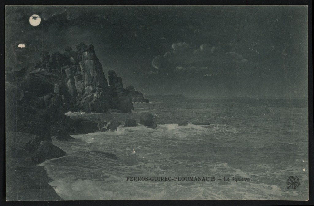 Carte postale ancienne représentant le rocher du Squewel à Ploumanac’h; Mathilde Delattre a posé son chevalet un peu plus près que le photographe mais sensiblement dans le même axe.