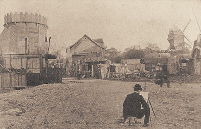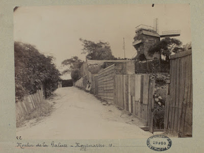 Eugène Atget, Le moulin de la Galette, 1899. On retrouve l’aspect de la ruelle palissadée qui est extrêmement proche de celui de la toile.