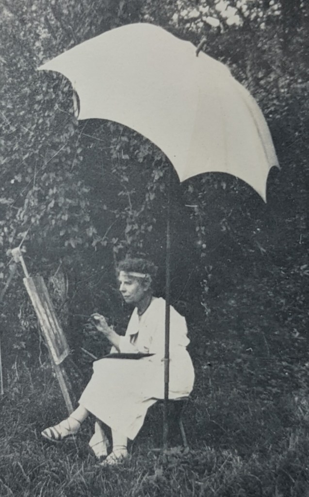 Mathilde Delattre peignant dans un des recoins de son cher jardin, qu’elle entretient aux Andelys.