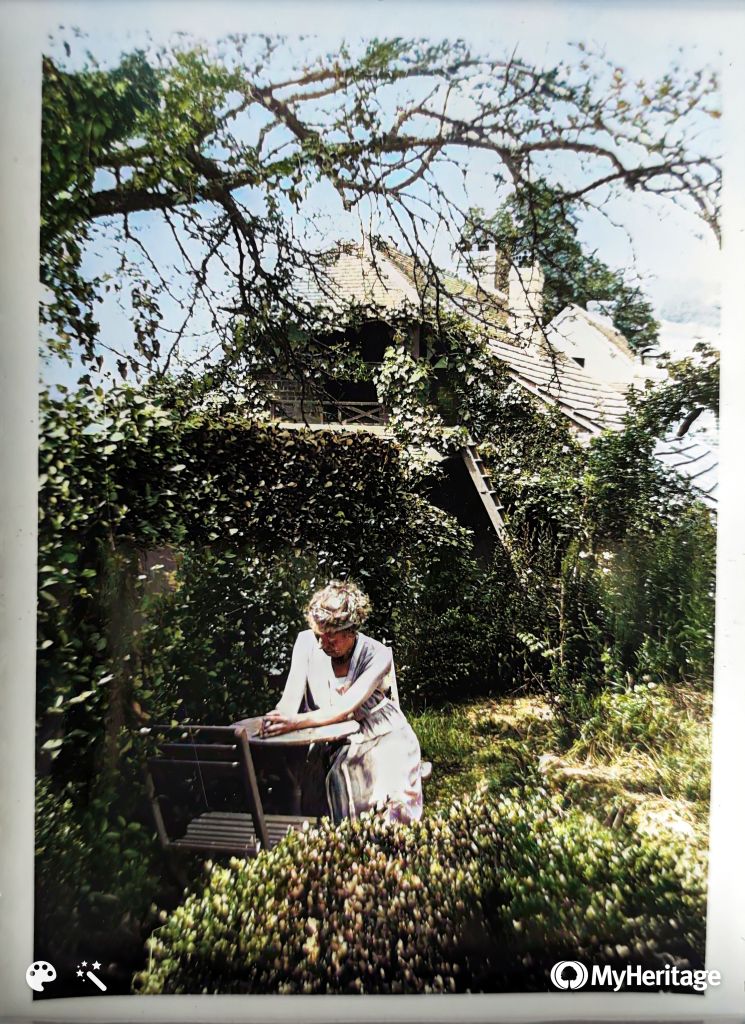 Mathilde Delattre médite dans son jardin des Andelys en 1937, avant de travailler à une toile. Cliché Madeleine Tétin, colorisation 2023.