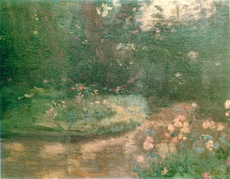 Mirra Alfassa, A Friend’s garden, huile sur panneau, 13,5 cm x 18 cm, ca 1905. Il s’agit d’un jardin où la future « Mère » méditait et eut une expérience de « sortie de son corps ».