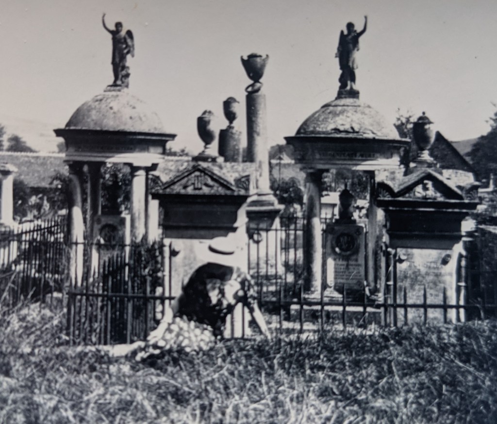 Mathilde Delattre méditant face à la tombe de sa mère Clémentine Crillon, ancien cimetière du Grand Andely, 1937.