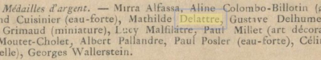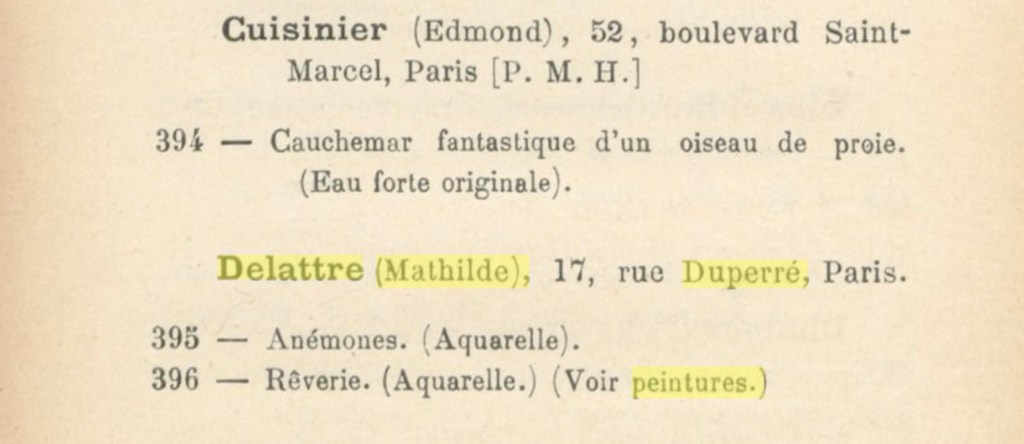 Autant d’hypothèses bien sûr sur la personnalité et le « carburant » énergétique de l’artiste, qui quoi que femme célibataire et sans soutien financier parvint à vivre de son art pendant plusieurs décades, sur un chemin qui n’était pas d’emblée tout tracé pour elle, puis à organiser de façon toujours autonome ses dernières années de vie, grâce à une grande force intérieure dont ce billet évoque quelques aspects. L’énergie créatrice restera certes toujours un secret d’artiste, mais espérons la re-découverte prochaine d’oeuvres et de témoignages autour de Mathilde Delattre qui permettront de mieux préciser quel était réellement l’esprit de son chemin intérieur.