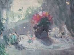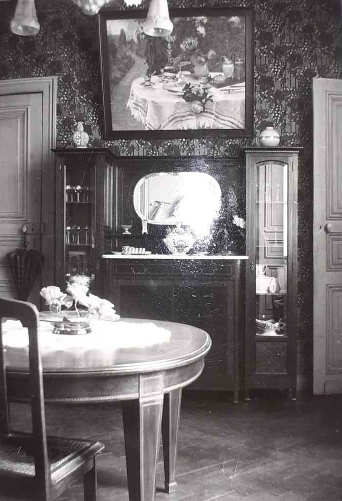 En haut à gauche, Le café, huile sur toile offerte à ses neveux, probablement en cadeau de mariage, peu après 1914 (en dessous, photo de la salle à manger roubaisienne, où la table se fait miroir). C’est pendant le 1er conflit mondial que Mathilde ressent, « exilée » en Bretagne – chez ses autres cousins – le besoin de s’éloigner de ses « grandes floraisons » académiques et des natures mortes florales d’intérieur pour évoluer vers son style de « plein air » où dominera le jardin, ses ambiances poétiques, ses tables déjà quittées par les convives mais en même temps invitant à leur présence, et à l’exploration un peu énigmatique par le chemin, très souvent présent, et qui invite déjà à dépasser cette table. La table richement garnie est initialement celle de la maison « Ma surprise » de Perros-Guirec, elle sera le thème de très nombreuses variations; les « coins de jardin » (cf. la table au pichet) seront ensuite saisis dans son refuge du Grand Andely.