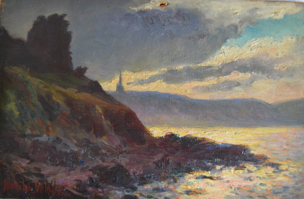 Dans les années 1900 et 1910, Mathilde Delattre saisit en Bretagne une série de paysages et d’intérieurs, les premiers sur de petits panneaux de bois qui ne semblent pas être des travaux préparatoires mais plutôt des « pochades« , comme l’artiste les décrivait elle même (il n’est pas exclu cependant que l’on inventorie des oeuvres de plus grand format retravaillées). Le style impressionniste parfois utilisé est-il lié à la rapidité d’exécution de ces « instantanés », ou bien est-il témoin d’une technique que l’artiste ne pouvait se permettre dans les salons qu’elle fréquentait ? Elle offre en général ces petites huiles à sa famille qui l’accueille. Au verso du « carton », parfois non signé, l’artiste note souvent au crayon l’endroit d’où elle travaille, où même l’heure exacte de sa « prise de vue ».