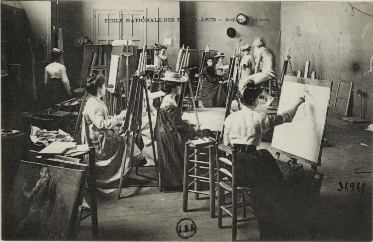 Gravitant autour de l’Union des femmes peintres et sculpteurs, créée en 1881 par Hélène Bertaux (1825 – 1909), de nombreuses jeunes femmes artistes parfois formées auprès de mêmes maîtres complètent leur formation en fréquentant mutuellement leurs ateliers respectifs, pour se perfectionner dans telle ou telle technique. En effet, l’école des Beaux-Arts leur est interdite, et ne leur ouvrira progressivement ses portes qu’à partir de 1897 !