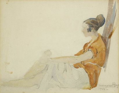 Germaine Boy 1920, Saviésanne assise, aquarelle et crayon 20 x 25 cm, vente Drouot