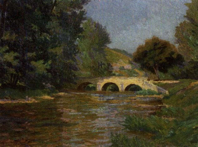 Madeleine Caudel, Pont ensoleillé au dessus d’une rivière, huile 60 cm x 80 cm