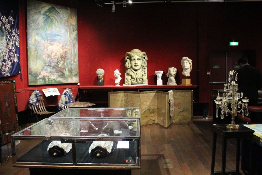 Une partie de la salle d’exposition de la vente Le Fur / Drouot Un appartement parisien, 2023. Le collectionneur de goût – qui détenait également nombre d’oeuvres orientalisantes – avait-il acquis la grande aquarelle, accrochée à gauche, au salon de l’Union de 1900 ?