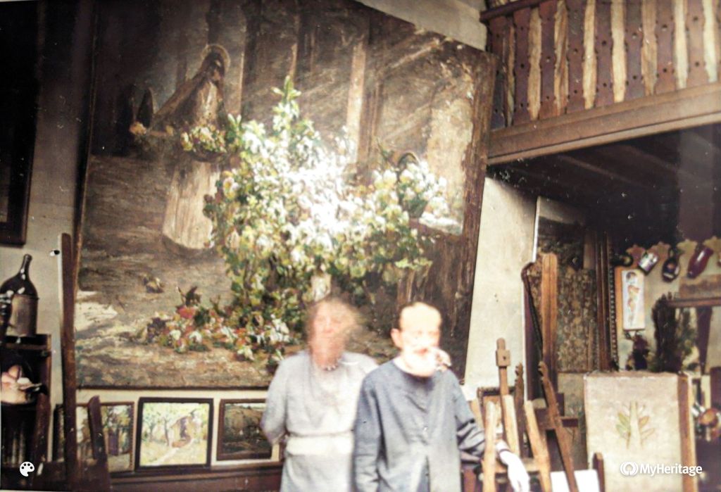 Mathilde Delattre dans son logement-atelier, devant « la grande toile », avec son frère « Geo », vers 1937 (cliché Madeleine Tétin, colorisation 2022)