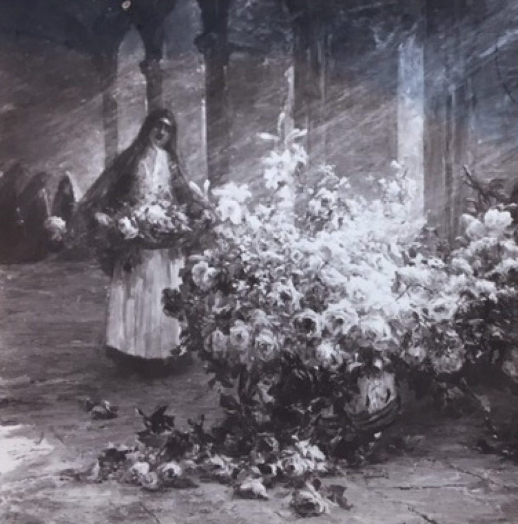 Veille de fête au cloître (détail), Salon des Artistes Français 1911 (n° 537), Salon de l’Union des femmes peintres et sculpteurs 1912 (HC), peinture à l’huile, 190 cm x 240 cm, localisation inconnue, photo-carte circulée, éd. Sélecta.